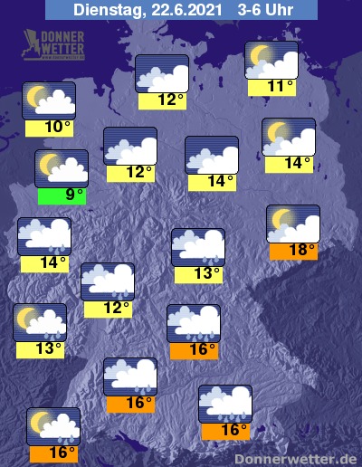 In der Nacht zum Dienstag halten sich über der Südhälfte meist dichte Wolken und es können sich wiederholt Schauer und vereinzelt auch Gewitter bilden. Über der Nordhälfte ist es teils stark, teils aufgelockert bewölkt, dazu bleibt es trocken. Die Temperatur sinkt auf 18 Grad in Dresden und bis 9 Grad in Münster.