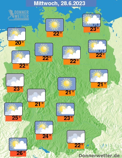 Am Mittwoch zeigt sich das Wetter im Land häufig heiter oder sonnig, vor allem im Nordosten und Südosten ziehen jedoch auch dichte Wolken durch, dabei können sich Schauer bilden, sonst bleibt es weitgehend trocken. Die Temperatur steigt auf 20 Grad an der Nordsee und bis 26 Grad im Breisgau.
