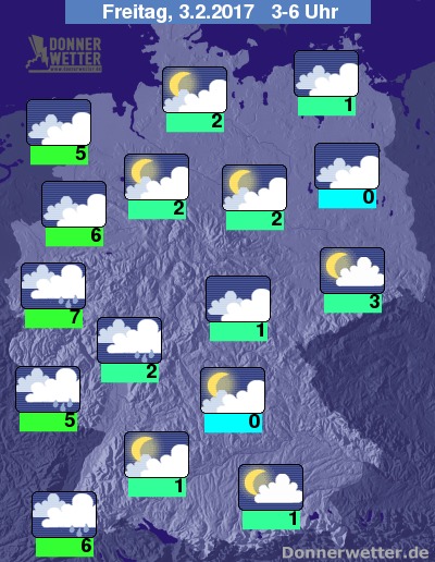 Dabei liegen die Höchstwerte am frühen Abend zwischen kühlen 0 Grad an der Ostsee und bis zu 10 Grad am Rhein.