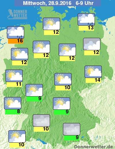 Die Temperaturen erreichen am Morgen Werte um 9 Grad C in Oberbayern und um 16 Grad C an der Nordseeküste.