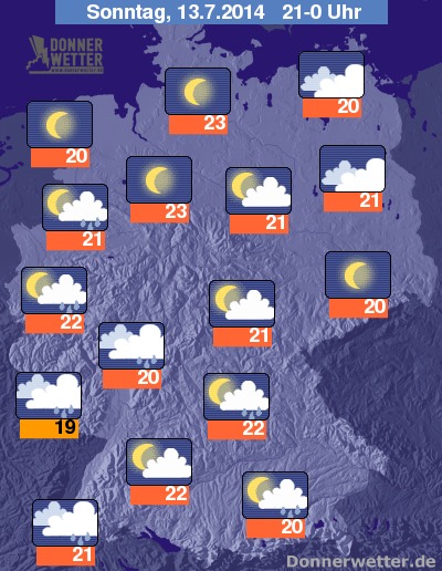 Angenehm sind die Temperaturen - sowohl im Osten als auch im Westen. Die Höchstwerte zum Anpfiff werden dann noch bei Werten um 19 bis 23 Grad C liegen.
