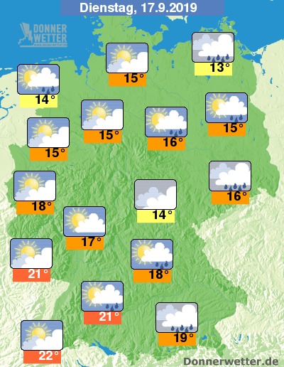 Die Tageshöchsttemperaturen bewegen sich zwischen kühlen 13 Grad an den Küsten und 19 Grad rund um München. Im Südwesten können nochmals angenehme 20 bis 23 Grad erreicht werden.