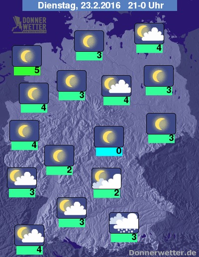 In der Nacht zum Mittwoch fällt am Alpenrand anfangs noch etwas Schnee, im übrigen Süden bleibt es oft neblig-trüb, jedoch trocken. Im Rest der Republik zeigt sich dagegen ein meist sternenklarer, hier und da ein locker bewölkter Himmel, dabei bleibt es trocken. Die Temperatur sinkt auf 3 Grad in Ostfriesland und bis -2 Grad im Grabfeld. Stellenweise besteht Glättegefahr durch möglichen Rauhreif!
