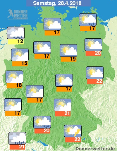 Am Samstag ziehen im Umfeld von Nord- und Ostsee überwiegend dichte Wolken durch, dabei bilden sich zeitweise Schauer. Einzelne Schauer und örtliche Gewitter entwickeln sich im Alpenvorland, im übrigen Bundesgebiet bleibt es bei teils heiterem, teils aufgelockertem Himmel trocken. Die Temperatur steigt auf kühle 12 Grad in Bremerhaven und bis auf 22 Grad in München.