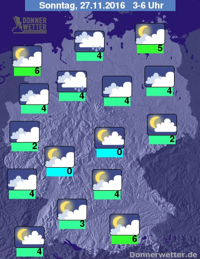 In der Nacht zum Sonntag ziehen von Norden her dichte Wolken mit Regen aus dem Norden weiter bis über die übrige Nordhälfte des Landes. In den Landesteilen weiter südlich ist es vor allem zu Beginn noch oft locker bewölkt, im weiteren Verlauf und bis zum Morgen aber meist stark oder noch aufgelockert bewölkt, dazu bleibt es größtenteils trocken. Die Temperatur sinkt auf 6 bis 0 Grad.