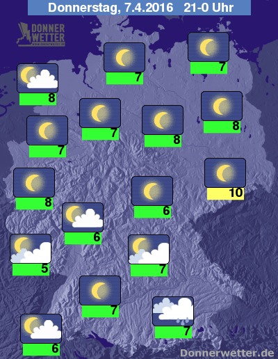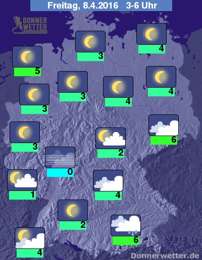 In der Nacht zum Freitag bleibt es im Alpenvorland bedeckt und es fällt zeitweise Regen, auch in einem breiten Streifen von Sachsen, über das nördliche Bayern bis ins südliche Baden-Württemberg halten sich meist dichte Wolken, wobei es hier trocken bleibt. Weiter nach Nordwesten hin zeigt sich der Himmel dagegen sternenklar und es bleibt dazu trocken. Die Temperatur sinkt auf 6 Grad in München und bis 0 Grad am Westerwald.