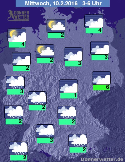 In der Nacht zum Mittwoch bleibt es über der Südhälfte des Landes bedeckt und die zeitweiligen Niederschläge gehen überwiegend in Schnee über, dabei besteht erhöhte Glättegefahr! Weiter nach Norden hin ist es teils locker bis aufgelockert, häufig aber auch stark bewölkt, dazu jedoch weitgehend trocken. Die Temperatur sinkt auf 6 Grad in Dresden und bis 1 Grad im Eichsfeld. Es weht teils noch starker, an der Ostsee teils stürmischer Wind, hier sind Sturmböen möglich.