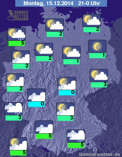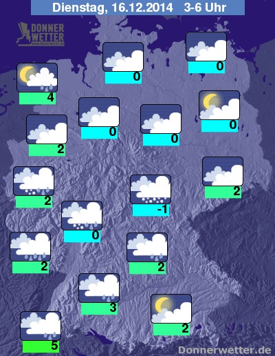 In der Nacht zum Dienstag ist es meist stark oder dicht bewölkt, vor allem zu Beginn aber auch teils aufgelockert. Es ziehen aber wieder zunehmend dichte Wolken auf die vor allem über der Südhälfte auch zeitweilige Niederschläge in Form von Regen, Schneeregen oder Schnee bringen. Dabei kann es nicht selten glatt auf den Straßen werden. Die Temperatur sinkt auf 5 Grad in Freiburg und etwa -1 Grad am Thüringer Schiefergebirge.