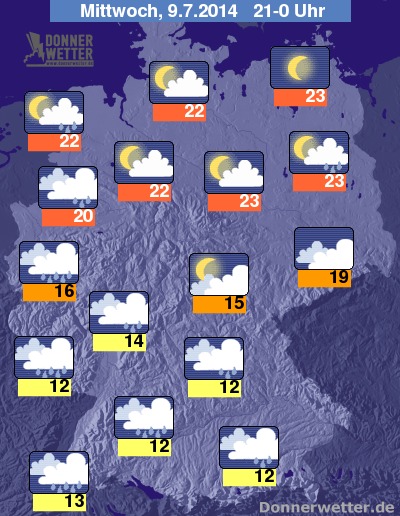 Am Abend regnet es im Westen und Süden weiter und längere Auflockerungen bleiben selten, weiter nach Norden und Osten werden die Schauer dagegen seltener, und im Norden kann der Himmel auch häufig aufklaren. Die Abendwerte liegen bei 23 Grad in Vorpommern und 12 Grad am Schwarzwald.