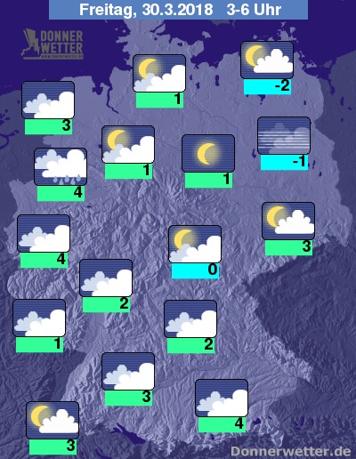 Die Tiefstwerte liegen in der Nacht zwischen frostigen -2 Grad an der Ostsee und vergleichsweise milden 4 Grad am Niederrhein.