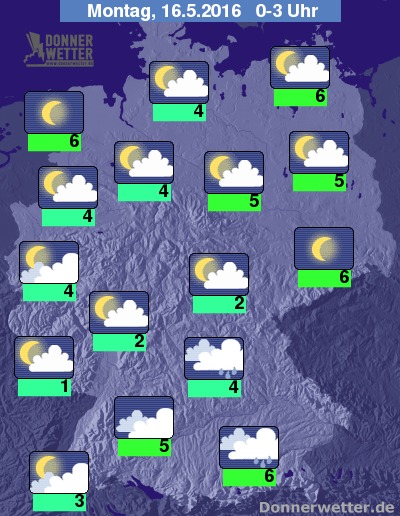 In der Nacht zum Pfingstmontag klart es vor allem in der Nordhälfte weitestgehend auf und vielerorts funkeln die Sterne. Lediglich in Bayern sind noch ein paar vereinzelte Schauer möglich. Dabei sinken die Temperaturen auf 1 Grad in der Pfalz und 6 Grad an den Küsten, in Sachsen und am Alpenrand. In Höhenlagen und Mulden ist auch Nachtfrost möglich.