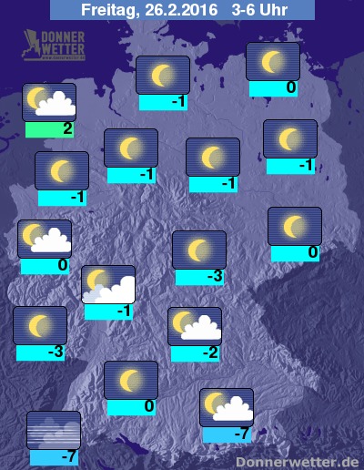 In der Nacht zum Freitag klingen letzte Schneefälle an den Alpen ab und auch an der Nordsee bleibt es bei teils noch starker Bewölkung mehr und mehr trocken. Im übrigen Bundesgebiet zeigt sich ein überwiegend sternenklarer Nachthimmel und es bleibt trocken. Die Temperatur sinkt auf 2 Grad im nördlichen Emsland und bis -7 Grad in München.