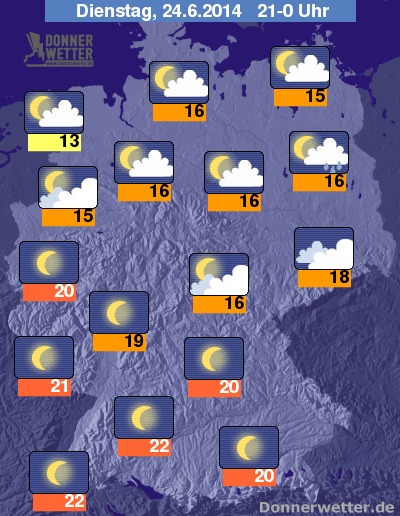 Am Abend ziehen besonders in der Nordhälfte noch häufig dichte Wolken mit einzelnen Schauern durch, im Süden und Südwesten ist es dagegen überwiegend klar und es bleibt trocken. Die Temperatur liegt bei teils noch 22 Grad in Karlsruhe und etwa 13 Grad in Emden.