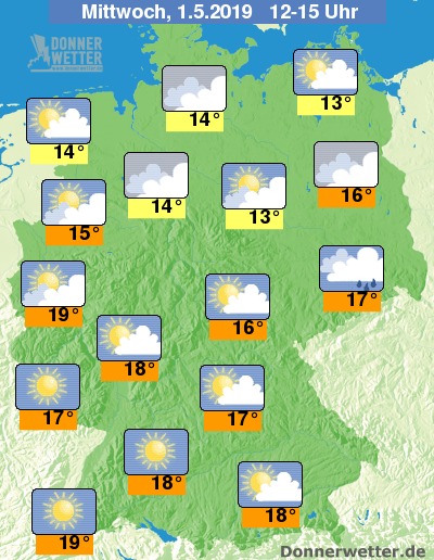 Die Temperaturen steigen im Laufe des Nachmittags auf 14 bis 19 Grad, im Südwesten und Westen können örtlich auch 20 Grad erreicht oder etwas überschritten werden.