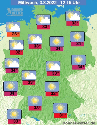 Heute Nachmittag scheint verbreitet die Sonne oder zieht nur lockere Bewölkung durch, dabei bleibt es trocken. Die Temperatur liegt bei angenehmen 26 Grad in Bremerhaven und bei sehr heißen 34 Grad entlang des Rheins.