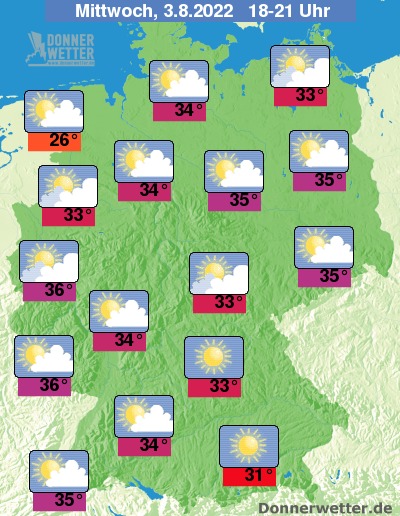 Heute Abend ist es weiterhin verbreitet heiter bis sonnig, hier und da sind auch schon einige, weitgehend harmlose Quellwolken möglich, dabei bleibt es weitgehend trocken. Die Temperatur liegt bei 26 Grad in Cuxhaven und bis 36 Grad in Saarbrücken.
