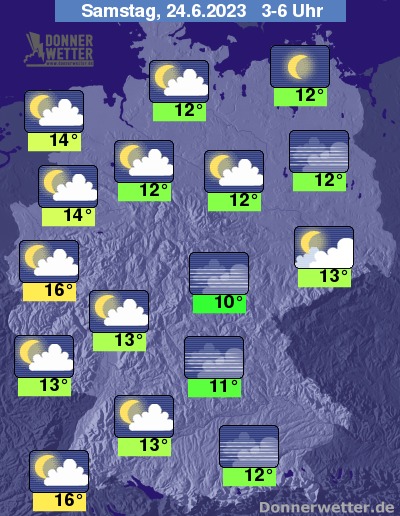 In der Nacht zum Samstag ziehen die letzten dichten Wolken auch im Osten rasch ab, sonst ist es schon meist locker bewölkt oder sternenklar. Es bleibt trocken bei 16 Grad am Rhein und etwa 10 Grad im Grabfeld.