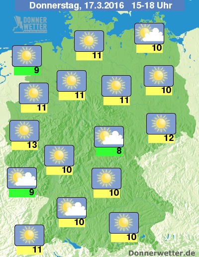 Heute Nachmittag scheint verbreitet die Sonne und es ziehen nur hier und da auch lockere Wolkenfelder durch, dabei bleibt es überall trocken. Im Norden können dichtere Wolken von der See herein ziehen. Die Temperatur steigt auf 8 Grad im Grabfeld und bis 13 Grad in Köln.