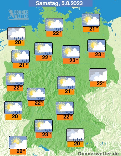 Am Samstag zieht häufig starke, teilweise auch lockere bis aufgelockerte Bewölkung durch. Es bilden sich zeitweise Schauer bei Höchstwerten von 20 Grad in München und rund 23 Grad in Berlin.
