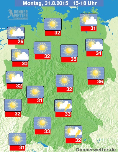 Heute Nachmittag ziehen besonders in den küstennahen Regionen oft dichte Wolken durch und es können sich hier zeitweise Schauer und Gewitter entwickeln. Sonst ist es im Norden heiter bis sonnig oder wechselnd bewölkt und weitgehend trocken. Von der breiten Mitte bis nach Süddeutschland zeigt sich der Himmel verbreitet sonnig oder nur leicht bewölkt. Gebietsweise sind jedoch auch dichter werdende Quellwolken möglich und vor allem in den westlichsten Landesteilen, aber auch sonst steigt das Schauer- und Gewitterrisiko etwas an, größtenteils bleibt es jedoch trocken. Die Temperatur steigt auf 26 Grad an der Nordsee und auf drückend heiße 36 Grad in Dresden.