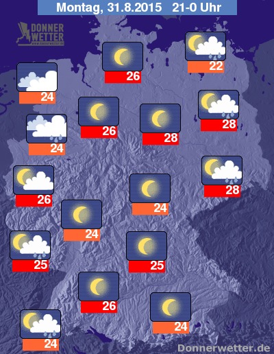 Heute Abend ziehen besonders in den westlichsten Landesteilen, gebietsweise jedoch auch im Nordosten und Osten der Republik dichte Quellwolken auf und es können sich zum Teil kräftige Schauer und Gewitter entwickeln. Im großen Rest des Landes zeigt sich dagegen ein verbreitet sternenklarer Abendhimmel und es bleibt trocken. Die Abendtemperaturen liegen bei schwülwarmen 28 Grad in der Lausitz und etwa 22 Grad in Rostock.