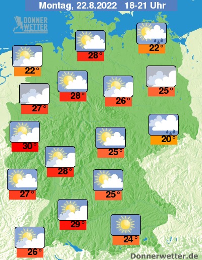 Heute Abend kann es über der Lausitz bei dichten Wolken gebietsweise regnen. Im übrigen Bundesgebiet ist es teils heiter, teils wechselnd bewölkt. Hier und da sind auch dichte Wolken möglich, dazu bleibt es aber trocken. Die Temperatur liegt bei 20 Grad in Dresden und bis 30 Grad in Köln.
