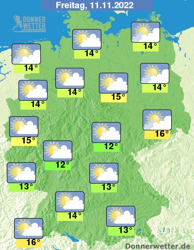 Am Freitag zeigt sich das Wetter über der Osthälfte häufig trüb oder stark bewölkt. Im übrigen Bundesgebiet ist es jedoch oft heiter oder sonnig, gebietsweise ziehen aber auch dichtere Wolken durch. Es bleibt landesweit trocken bei Werten von 12 Grad in Erfurt und bis 16 Grad in Freiburg.
