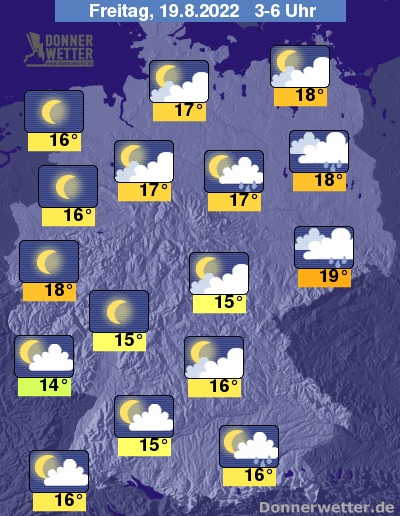 In der Nacht zum Freitag bleibt es über dem Osten und im Süden Bayerns meist bedeckt und es bilden sich hier weitere Schauer, vor allem am Abend auch lokale Gewitter. Im übrigen Land ist es oft locker bis wechselnd bewölkt. Im Westen und Nordwesten wird es verbreitet auch sternenklar, dazu bleibt es trocken. Die Temperatur sinkt auf 19 Grad in Dresden und 14 Grad in Saarbrücken.