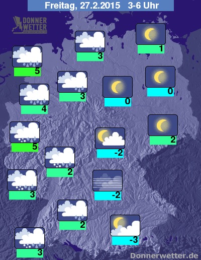 In der Nacht zum Freitag verlagern sich die dichten Regenwolken ein Stück weiter nach Osten, jedoch bleibt es in der Osthälfte selbst weiterhin oft sternenklar oder nur locker bewölkt und dazu trocken. In der Westhälfte fällt jedoch zeitweise Regen, zum Teil sind auch Schneeregen oder Schnee möglich. Örtlich kann es glatt auf den Straßen werden. Die Tiefstwerte liegen bei 5 Grad in Emmerich und um -3 Grad im Pfaffenwinkel.
