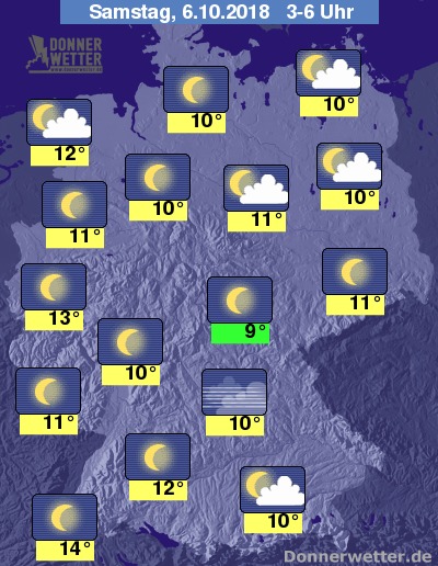 Während der zweiten Nachthälfte bleibt es vielfach sternenklar oder nur leicht bewölkt. In einigen Flussniederungen und Mittelgebirgstälern können sich allerdings wieder Nebelfelder bilden. Bis zu den Frühstunden kühlt die Luft bei einem schwachen Wind auf 9 bis 14 Grad ab, was für einen Oktober schon nahezu ungewöhnlich mild ist.