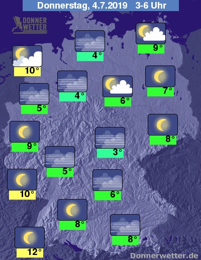 Die Temperaturen gehen bis zu den Frühstunden auf 3 Grad im Thüringer Becken und 12 Grad im Breisgau ab.