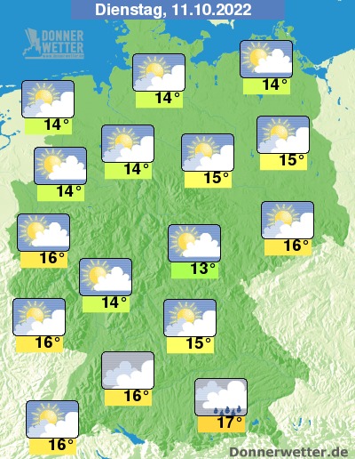 Am Dienstag ist es im Süden meist stark, im übrigen Land zum Teil locker, teils jedoch auch stark bewölkt. An den Alpen bilden sich örtliche Schauer, sonst bleibt es weitgehend trocken. Die Temperatur steigt auf 13 Grad im Vogtland und bis 17 Grad in Berchtesgaden.
