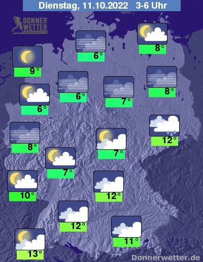 In der kommenden Nacht halten sich über der Südosthälfte Deutschlands noch meist dichte Wolken, die jedoch nur noch selten Schauer bringen. Im übrigen Land klart der Himmel verbreitet auf oder es ziehen nur wenige Wolken durch, dazu bleibt es trocken. Stellenweise bildet sich Nebel. Die Temperatur sinkt auf 13 Grad in Freiburg und 6 Grad in Hamburg.