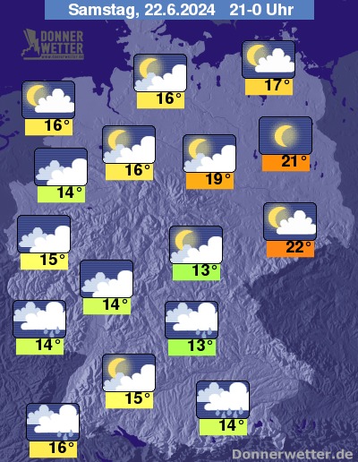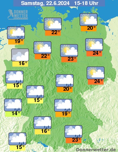 Im Süden und Südwesten nimmt die Bewölkung in den Nachmittagsstunden zu, dabei muss zum Abend mit teils schauerartigem Regen und lokalen Gewittern gerechnet werden. Lokale Unwettergefahr nicht ausgeschlossen.