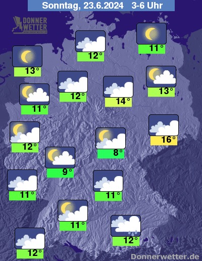In der Nacht zum Sonntag bleibt der Himmel über dem Süden Deutschlands stark bewölkt, dabei fällt vor allem im südöstlichen Bayern und am Alpenrand weiterer teils schauerartiger Regen. In den übrigen Landesteilen ist es teils wolkig, teils nur gering bewölkt und es bleibt meist trocken.