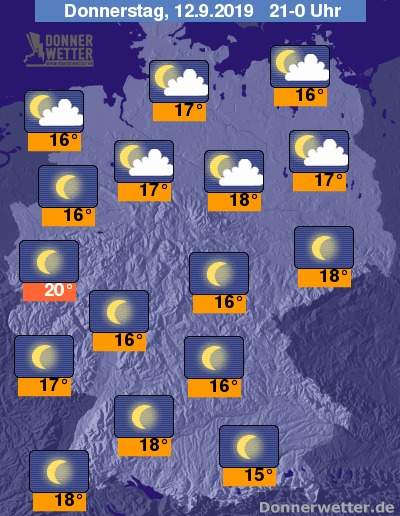 Während der zweiten Nachthälfte kann es im Küstenumfeld der Nordsee, sowie in Schleswig-Holstein zu Regenfällen kommen, auch im Westen können die Wolken etwas dichter werden. Sonst präsentiert sich der Himmel jedoch häufig sternenklar oder nur leicht bewölkt. In der Südhälfte können sich im weiteren Verlauf stellenweise Nebelfelder bilden.