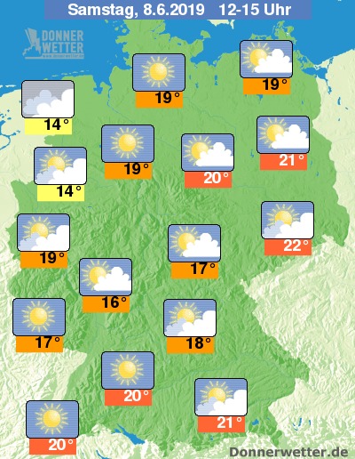 Heute Nachmittag ist es noch überwiegend heiter bis sonnig und trocken, im Norden und Westen ziehen jedoch hier und da auch schon mehr und teils dichte Wolken auf, dazu bleibt es aber noch weitgehend trocken. Die Temperatur liegt bei 14 Grad an der Nordsee und bis 22 Grad in der Lausitz.