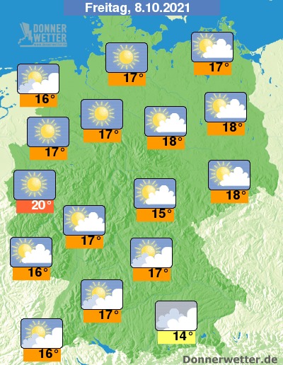 Am Freitag bleibt es im Süden oft neblig-trüb oder stark bewölkt, teils zeigen sich hier aber auch heitere Abschnitte. Im übrigen Bundesgebiet ist es überwiegend heiter bis sonnig. Es bleibt landesweit trocken bei Höchstwerten von 14 Grad in München und bis 20 Grad in Köln.