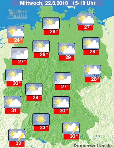 Am frühen Nachmittag gibt es eine freundliche Mischung aus Sonne und meist nur lockeren Wolken, regional scheint die Sonne auch längere Zeit. Über dem Erzgebirge und dem südlichen Schwarzwald können die Wolken teilweise auch mal mächtiger werden und lokale Regengüsse oder einzelne Gewitter produzieren. Die Temperaturen bewegen sich in der Regel zwischen 26 und 33 Grad. Etwas kühler bleibt es direkt an den Küsten und auf den Bergen. Der Wind weht meist nur schwach.