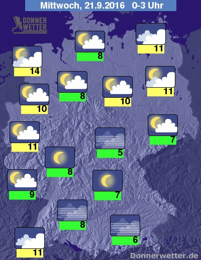 In der Nacht zeigt sich der Himmel in der Nordhälfte meist locker, an den Küsten auch mal dichter bewölkt. Im Süden ist es klar, selten auch mal locker bewölkt, vor allem entlang der Donau kann sich vielerorts Nebel bilden.