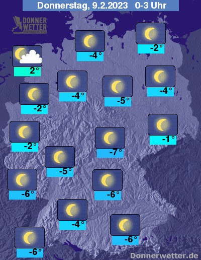 Die Temperaturen gehen in den Frühstunden auf Werte um -2 bis -7 Grad im Flachland zurück; lokal frostfrei bleibt es an der Nordseeküste.