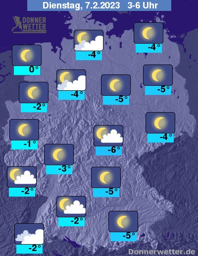 Die Temperaturen gehen in den frühen Morgenstunden im Flachland auf Werte um 0 bis -6 Grad zurück. In den südlichen und östlichen Mittelgebirgen sinken die Temperaturen in der Nacht auch teils unter die -10-Grad-Marke.