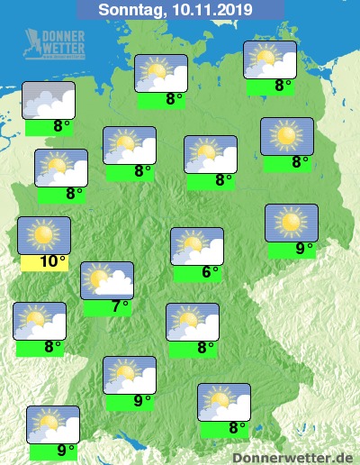 Am Sonntag zeigt sich das Wetter überwiegend heiter bis sonnig, örtlich aber auch stark bewölkt oder trüb. In den westlichen Landesteilen ist es gebietsweise stark bewölkt, es bleibt aber überall trocken. Die Temperatur steigt auf 6 bis 10 Grad.