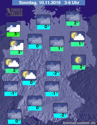 In der Naht zum Sonntag ist der Himmel sternenklar oder locker bewölkt, lediglich an er Nordsee halten sich oft dichte Wolken, dabei bleibt es trocken. Die Temperatur sinkt auf 5 Grad in Cuxhaven und bis -2 Grad im Eichsfeld.