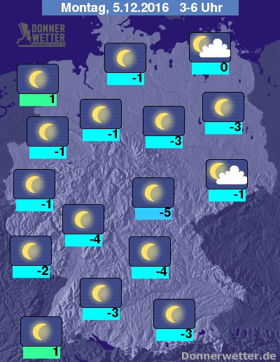 In der folgenden Nacht ist der Himmel fast über dem gesamten Bundesgebiet sternenklar. Einige, jedoch weitgehend nur lockere Wolkenfelder ziehen über den Nordosten und Osten des Landes hinweg. Es bleibt überall trocken bei Tiefstwerten zwischen 1 Grad im Oberrheingraben und -5 Grad in Oberfranken.