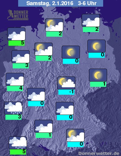 In der Nacht zum Samstag bleibt es im Osten meist sternenklar, im Nordosten, Südosten und auch in der Landesmitte ziehen meist einige, teils auch dichte Wolken auf, es bleibt jedoch weitgehend trocken. Über der Südwesthälfte bleibt die Wolkendecke meist geschlossen. In der zweiten Nachthälfte zieht im Südwesten Regen auf, der sich bis Sonnenaufgang bis etwa zu einer Linie vom westlichen NRW bis zum Bodensee hin ausbreitet. Die Temperatur sinkt auf 5 Grad in Freiburg und etwa -1 Grad im Thüringer Becken. An der Nordsee weht starker bis stürmischer, an der Ostsee teils starker Wind,
