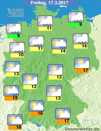 Eine Zweiteilung bahnt sich dann am Freitag an: Im Norden regnet es aus dichten Wolken immer wieder, weiter südlich wechseln sich Sonne und Wolken im Tagesverlauf ab. Die Temperaturen erreichen Werte um 9 Grad C an der Küsten und um 17 Grad C am Alpenrand.
