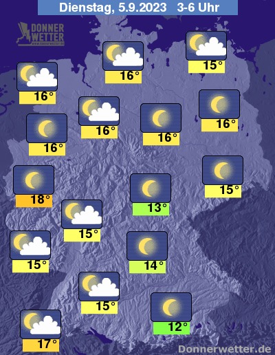 In der Nacht zum Dienstag ist der Himmel sternenklar oder lockr bewölkt, dazu bleibt es trocken. Die Temperatur sinkt auf 18 Grad in Köln und bis 12 Grad in Augsburg.
