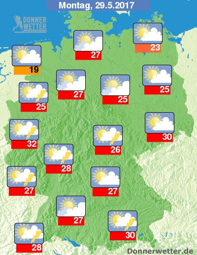 Am Montag ist es häufig heiter oder sonnig, gebietsweise ziehen aber auch einige, teils dichte Quellwolken durch. Besonders über der breiten Landesmitte und am Alpenrand besteht ein erhöhtes Schauer- und Gewitterrisiko. Die Temperatur steigt auf eher kühle 19 Grad direkt an der Nordsee und bis auf schwülheiße 32 Grad in der Kölner Bucht.