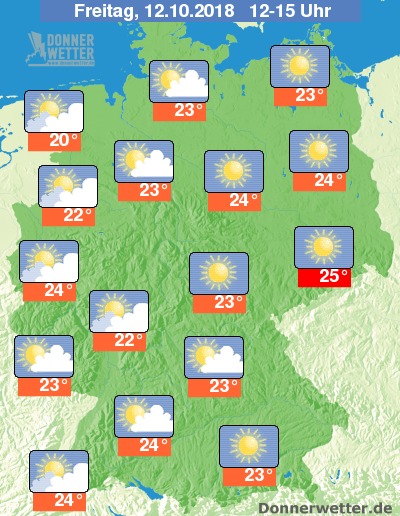 Am frühen Nachmittag halten sich im Westen noch vermehr Schleier- und mittelhohe Wolkenfelder mit milchigem Sonnenschein. Sonst ist der Himmel überwiegend blau oder leicht bewölkt und die Sonne strahlt verbreitet. Mit Temperaturen von 20 bis 25 Grad wird es wieder spätsommerlich warm.
